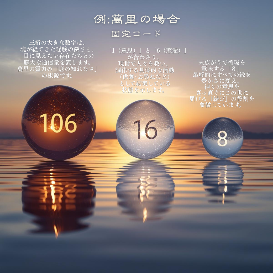 流動コード(運命の調律) 萬里がその時々のあなたの周波数を霊査し、今この瞬間に必要な「調整用」の数字を降ろします。季節の変わり目や、大きな決断の前に必要な「心の処方箋」です。サブスク継続特典、デジタル結界(期限あり)に組み込むのは、この「流動コード」です。
